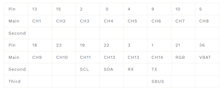 注: 受信機が CRSF 出力を使用するように設定されている場合、CH13 は RX になり、CH14 は TX になります。 受信機が SBUS 出力を使用するように設定されている場合、CH13 には出力がなく、CH14 は SBUS になります。
