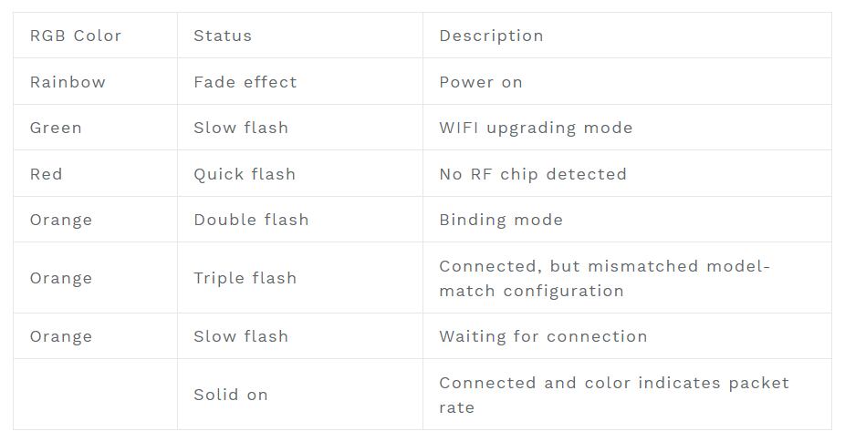 RGB インジケーターが緑色の遅い点滅状態になり、受信機は自動的に WiFi をオンにします (WiFi 名: ExpressLRS RX、WiFi パスワード: ExpressLRS)