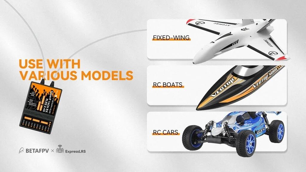 ExpressLRS 受信機プロトコルは、マルチローター、固定翼機、ヘリコプター、RC カー、RC ボートなど、より多くのモデルに広く使用できます。2 つのアンテナとデュアル受信機チェーンの設計は、長距離飛行と飛行の要件を大幅に満たします。 航空写真。