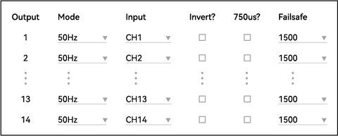 RX が SBUS 出力を使用するように設定されている場合、CH13 には出力がなく、CH14 は SBUS になります。