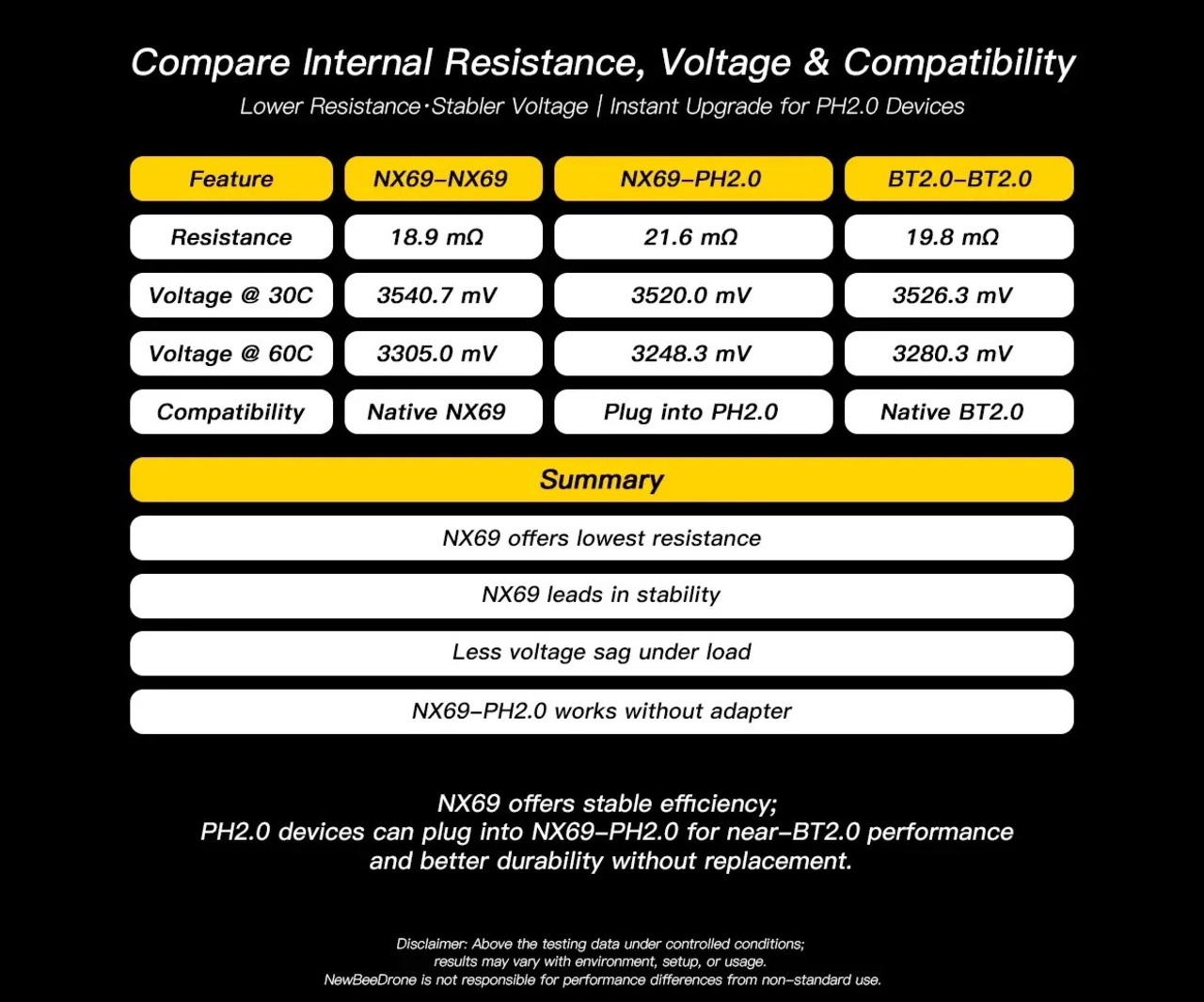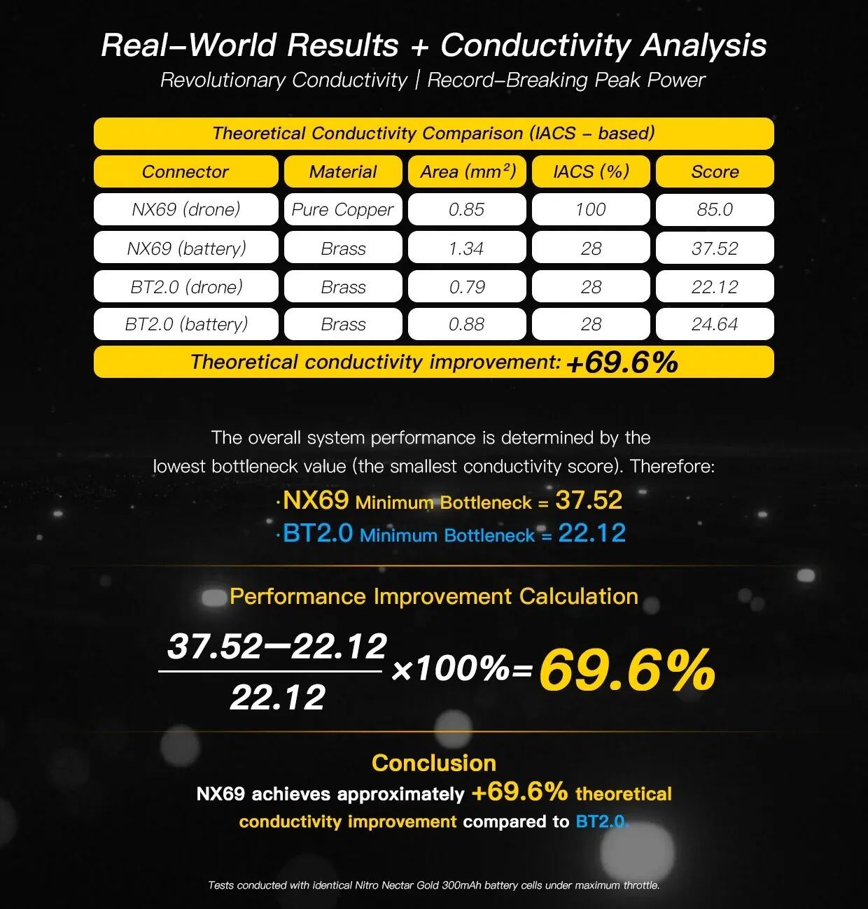 このコネクターは、ドローン側に純銅(0.85mm²)、バッテリー側には拡張された真鍮コンタクト(1.34mm²)を採用しており、BT2.0 と比較して 理論上69.6% の導電性能向上 を実現。この技術的ブレイクスルーが「NX69」という名称の由来となっています。