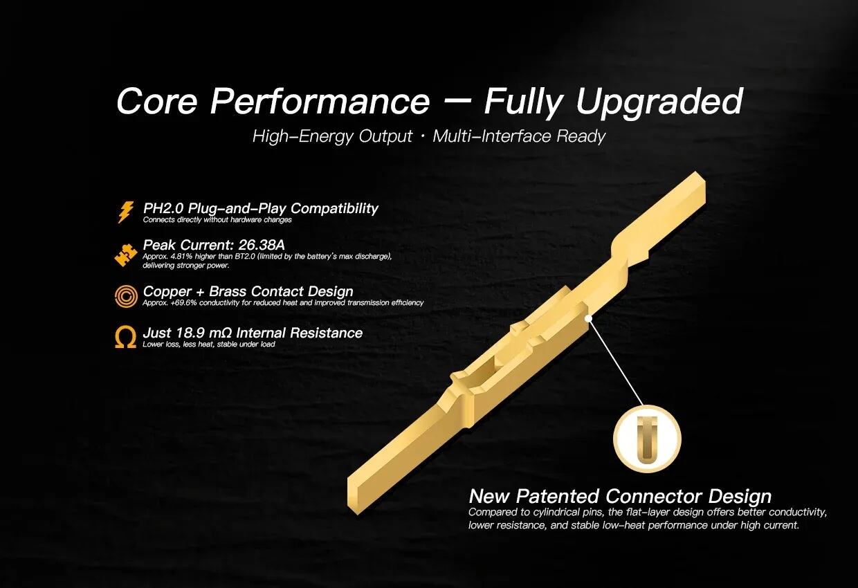 機体側は純銅(0.85mm²)、バッテリー側は大型化した真鍮コンタクト(1.34mm²)を採用。 BT2.0比で +69.6% の理論導電性向上 を実現し、これが「NX69」という名称の由来にもなっています。