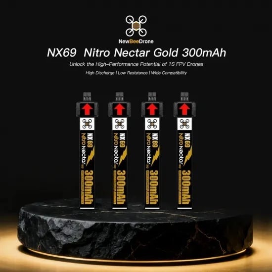 NewBeeDrone Nitro Nectar NX69 300mAh HV LiPo Battery(4本セット)は、1S FPVレース機やフリースタイル機で、80Cの高放電性能を最大限に引き出すために設計されたバッテリーです。新世代コネクター「NX69」を採用することで、BT2.0 コネクターと比べて実測ピーク電流が 4.81% 向上(26.38A 対 25.17A)。より力強いスロットルパンチ、鋭いレスポンス、そして高負荷フライト中でも安定したパワーを提供します。