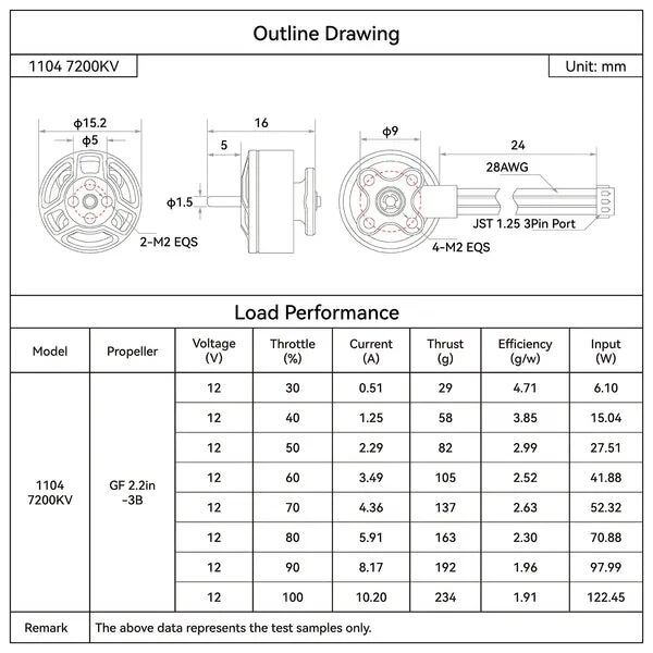 上記のGFプロペラと組み合わせると、低スロットルで飛行しているときの力効率は4.7g/wにも達し、フルスロットル負荷状態でも1.9g/wに達し、クワッドに効率的な推進システムを提供します。