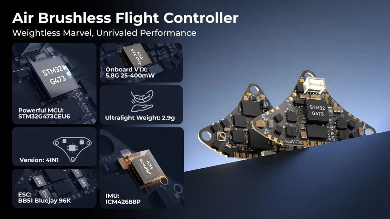 Air Brushless Flight Controller(4IN1)はG473プロセッサを使用した最初の1S FCで、ICM42688Pジャイロを搭載し、FC、ESC、OSD、5.8G 25mw~400mw VTXを統合しています。